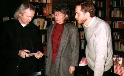 | Ócáid seolta Da Mihi Manum, Béal Feirste, Bealtaine 1994. Ó chlé: Ciarán Ó Duibhín, Marion Gunn, Michael Everson. |